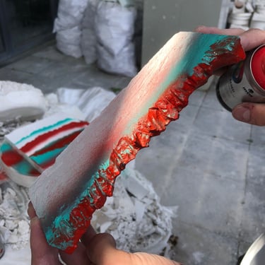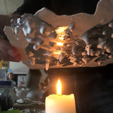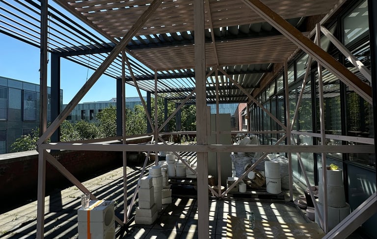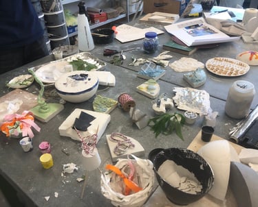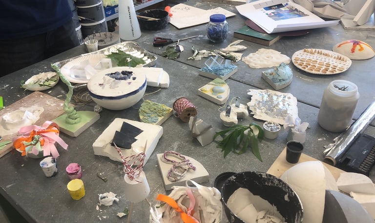 Gipswürfel als zerstörbare Objekte zu entwickeln. Diese waren mit Sprüchen gefüllt, die erst beim zerschlagen sichtbar wurden – vergleichbar mit Glückskeksen, jedoch als „Wutkekse“ gedacht. Ergänzend kamen alte Gipsobjekte aus vorherigen Kursen zum Einsatz, die in die Installation integriert wurden. Der Fokus: Das Zerstören der Gipswürfel führte unmittelbar zur Freilegung einer Botschaft. Dadurch entstand ein Spannungsfeld zwischen der aggressiven Handlung des Zerschlagens und dem oft überraschend positiven, nachdenklichen oder auch ironischen Inhalt im Inneren. Die Teilnehmenden konnten allein oder in Interaktion mit anderen agieren. Die Installation lädt dazu ein, den Ausdruck von Emotionen wie Wut oder Frustration nicht nur destruktiv, sondern auch transformativ zu begreifen. Jedes zerstörte Objekt brachte etwas Neues hervor – eine Botschaft, einen Gedanken, eine Reflexion. So wurde sichtbar, dass Zerstörung nicht nur Verlust bedeutet, sondern auch die Möglichkeit birgt, verborgene Inhalte und neue Perspektiven freizulegen.