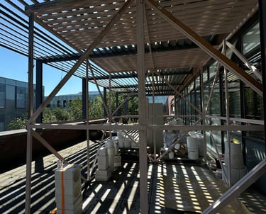 Ausgehend von einer intensiven Auseinandersetzung mit der Künstlerin Alexandra Daisy Ginsberg und insbesondere ihrem Werk „Resurrecting the Sublime“, haben wir eine assoziative Wortwolke entwickelt. Neben Begriffen wie erlebbar, multisensorisch oder Verlust, kristallisierten sich dabei als besonders prägnant fünf Begriffe heraus: Zerstörung, Symbiose, Repetition, Geometrie und Verbindung. Inspiriert von dieser Begriffswelt entstanden erste gestalterische Experimente mit Farbe, Stoffen, Licht, Verbindungs- elementen und unterschiedlichen Formen der Zerstörung. Dabei rückten einige Fragen ins Zentrum unserer Arbeit: