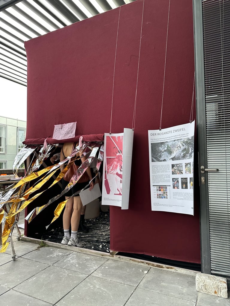 Konzeptfarben waren rosa und rot. Das Holzgestell wurde mit rotem Molton abgehangen, um einen abgetrennten und geschützten Raum zu schaffen.